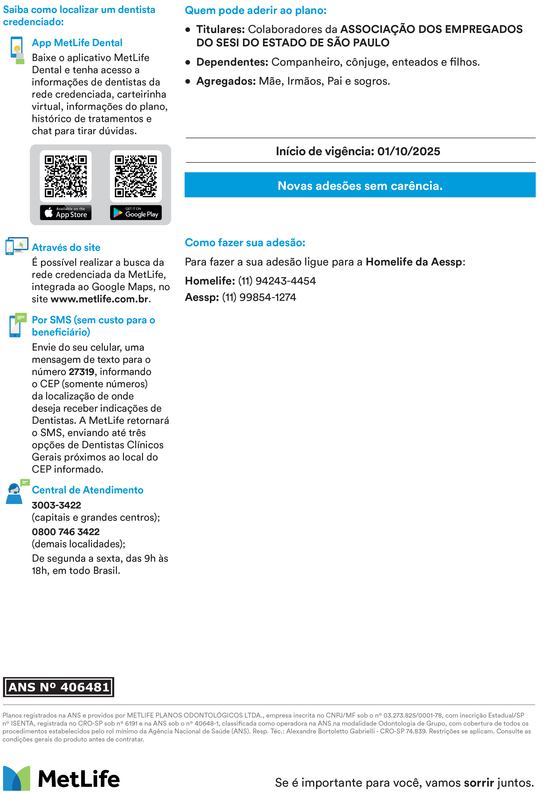 Acessem nosso link Arquivos e vejam mais detalhes sobre coberturas e planos através do INFORMATIVO - NOVO PLANO ODONTOLÓGICO. Também encontrarão o TERMO DE ADESÃO AO BENEFÍCIO ODONTOLÓGICO METLIFE.